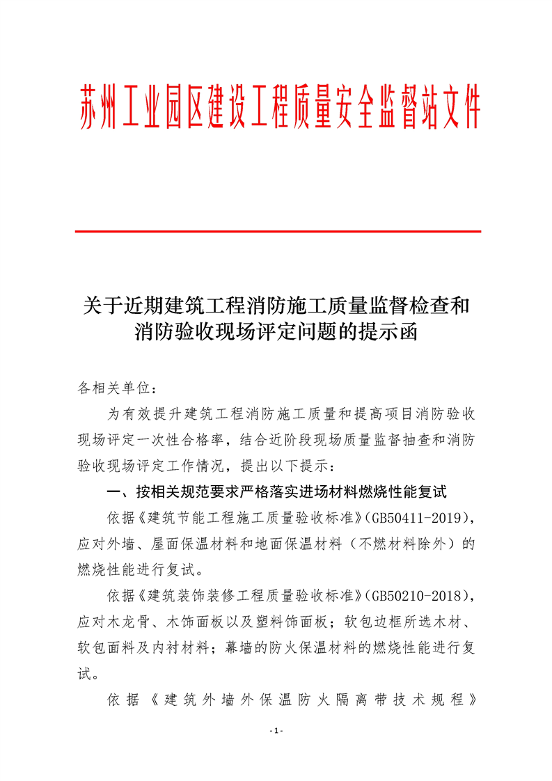 關于近期建筑工程消防施工質量監督檢查和消防驗收現場評定問題的提示函