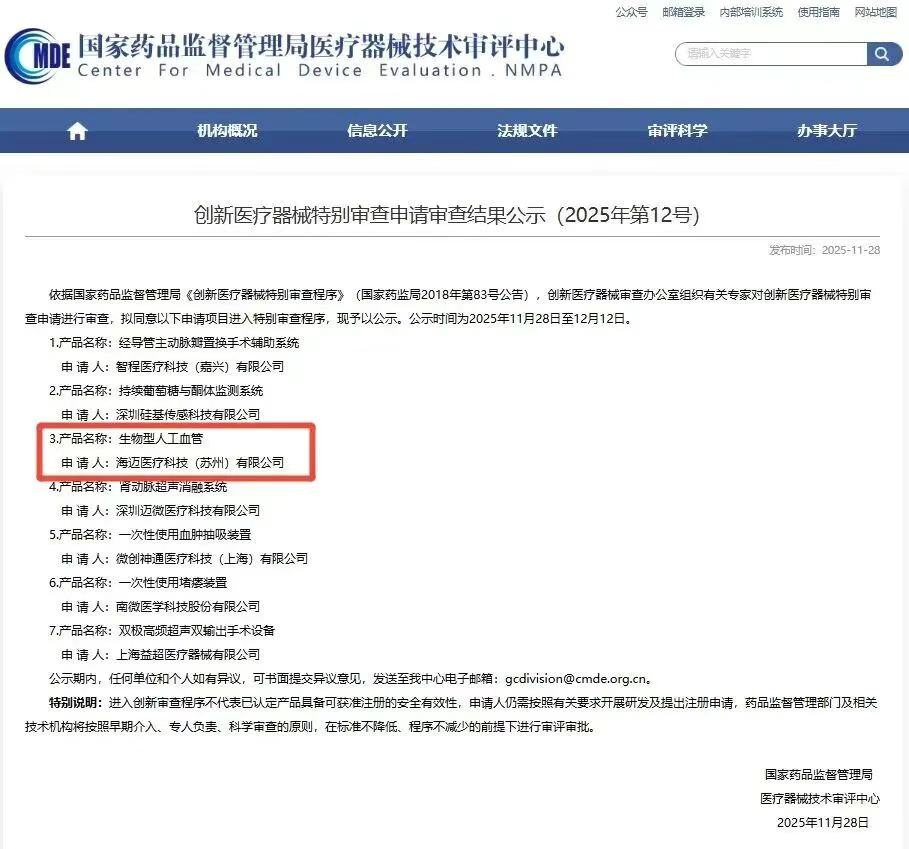 海邁醫(yī)療此次進(jìn)入這一程序的產(chǎn)品是國產(chǎn)首款進(jìn)入特別審查程序的小口徑(≤6mm)生物型人工血管,標(biāo)志著在解決慢性腎衰血液透析血管通路這一重大臨床需求上,國產(chǎn)高端醫(yī)療器械實(shí)現(xiàn)了關(guān)鍵技術(shù)突破并取得重大里程碑進(jìn)展。
