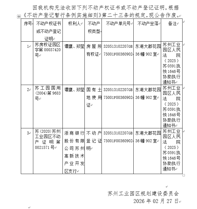 不動產權證書/登記證明作廢公告蘇園 證廢字2026(0051)號(東湖大郡花園36幢902室)