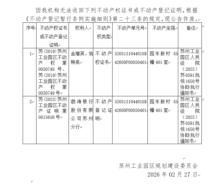 不動產權證書/登記證明作廢公告蘇園 證廢字2026(0047)號(園東新村85幢401室)
