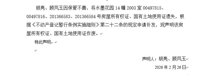 關于水墨花園14幢2003室00497815、00497816、201366583、201366584號房屋所有權證、國有土地使用證遺失聲明
