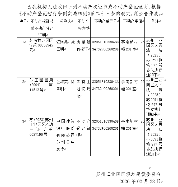 不動(dòng)產(chǎn)權(quán)證書/登記證明作廢公告蘇園 證廢字2026(0054)號(hào)(亭南新村26幢201室)