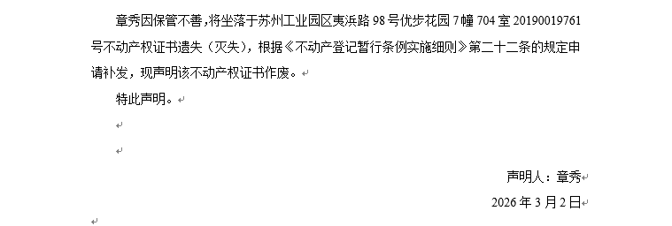 關于蘇州工業園區夷浜路98號優步花園7幢704室20190019761號不動產權證書遺失聲明