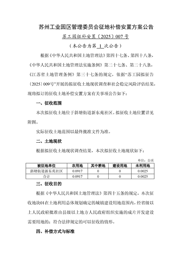 蘇州工業(yè)園區(qū)管理委員會(huì)征地補(bǔ)償安置方案公告(蘇工園征補(bǔ)安置〔2025〕007號(hào))