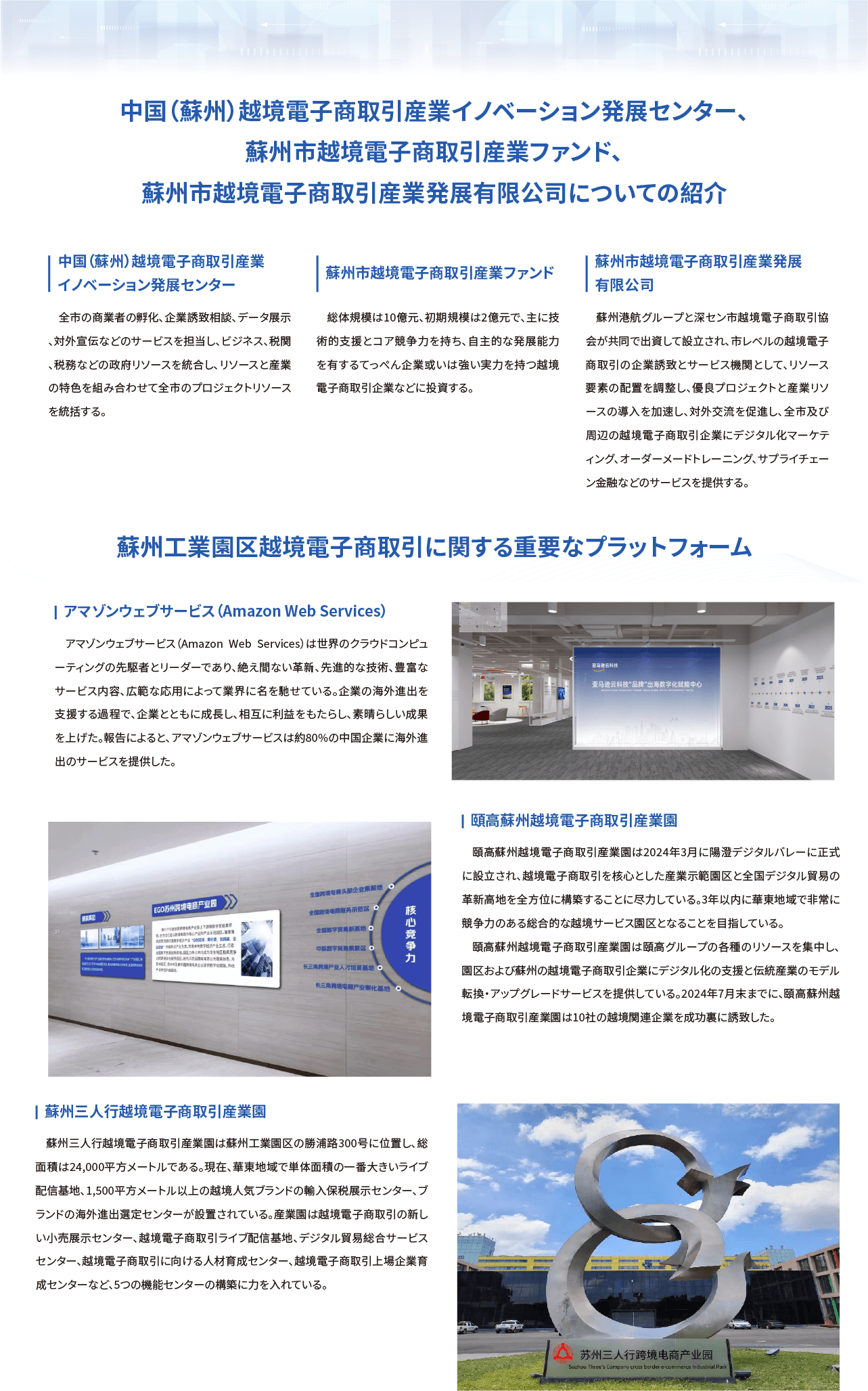 8月20日、蘇州市越境電子商取引「八つの一」推進會並び蘇州工業園區越境電子商取引発展會議が陽澄デジタルバレー?南岸新地で開催された。中國(蘇州)越境電子商取引産業イノベーション発展センター、蘇州市越境電子商取引産業発展有限公司、蘇州市越境電子商取引産業ファンドが正式に設立され、開業した。 イベントの現場では、蘇州市越境電子商取引「八つの一」プロジェクトの始動式が行われた?!赴摔膜我弧攻抓恁弗Д趣咸K州市委員會、蘇州市政府が越境電子商取引に関する総合的なサービス體系を完備させ、良好な産業生態を構築するための重要な措置である。 會議では、企業に商品展示や便利な越境申告などの公益サービスを提供する蘇州工業園區越境電子商取引サービスプラットフォームが発表された。 現場では、蘇州工業園區越境電子商取引産業企業誘致プロジェクトの調印式が行われた。また、越境電子商取引業界の代表企業を招き、それぞれテーマ共有を行った。 蘇州工業園區越境電子商取引人材誘致シーズンの正式なスタートに伴い、一連の公益の越境電子商取引人材就職説明會、人材交流活動が全國... [MORE]