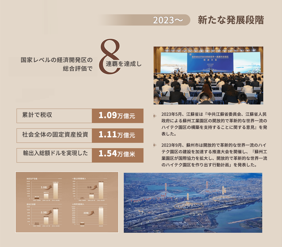 8月27日、蘇州工業園區開発建設30周年を記念するプロモーションビデオが公開された。 1994年、蘇州古城の東側にあるこの水たまりの低地は、中國とシンガポール両國の政府が協力する重要なプロジェクトとなった。その年、蘇州工業園區という真新しい名前を得て、英語の略稱SIPとして、想像を超える未來へ踏み出した。 10年の間に、新しい蘇州が再生され、15年の間に「四つの千億超」を達成した。2016年以降は國家級経済技術開発區の総合評価で1位に躍進し、「八連覇」を維持している。30年の間に、「園區のスピード」で雄大な気勢を持つ改革の敘事詩を書き上げ、園區は中國の改革開放の重要な窓口となった。 この土地は蘇州の3%の面積で、全市の約15%のGDPを生み出し、1平方キロメートルあたりのGDP が10.5億元、一人當たりのGDPが 35.4萬元の成果を上げ...