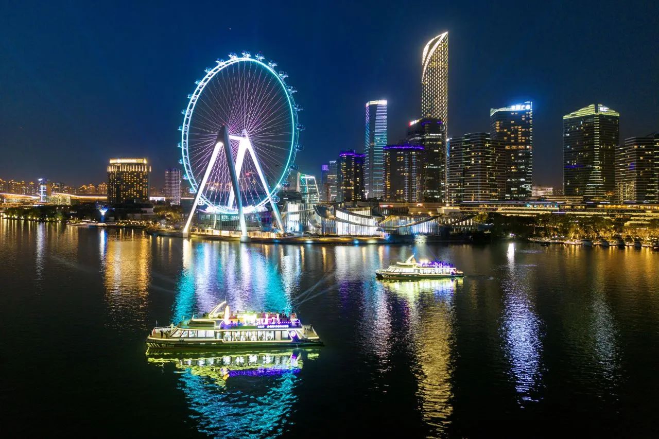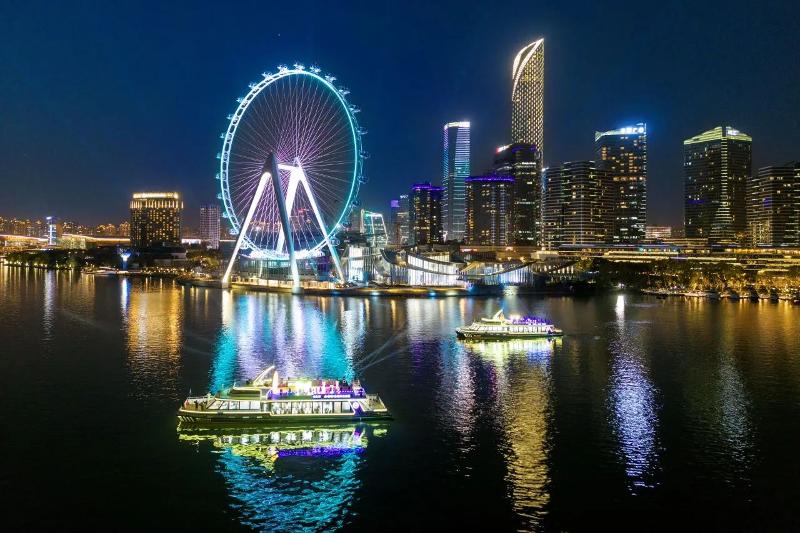 如果說“蘇州之眼”是天空的詩篇,那么右岸新航線就是水面的畫卷。夜幕降臨,“蘇州之眼”摩天輪星光閃耀,金雞湖雙體新游船霓虹流轉(zhuǎn),水岸光影交相輝映,為園區(qū)這座現(xiàn)代化新城更添了幾分夢(mèng)幻與浪漫色彩,令人流連忘返。