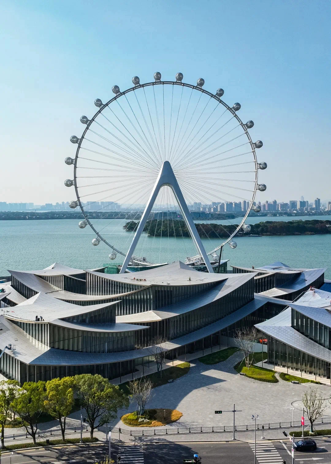 據(jù)介紹,“蘇州之眼”的設(shè)計(jì)靈感源于江南水鄉(xiāng)的柔美與蘇州園林的意境。通過異型雙立柱輪輻式結(jié)構(gòu)及回轉(zhuǎn)式太空艙,既保留了傳統(tǒng)水鄉(xiāng)的婉約氣質(zhì),又以科技感造型融入現(xiàn)代CBD天際線。摩天輪底部建筑運(yùn)用“折紙藝術(shù)”,采用折扇形屋頂及大面積落地玻璃設(shè)計(jì),打造“濱水而居”的獨(dú)特空間體驗(yàn)。