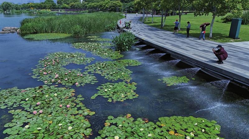 昨天,環(huán)金雞湖步道新安裝的凈水系統(tǒng)啟用,一排噴頭不斷向湖面噴射清水,使湖水快速流動(dòng),有效防止藍(lán)藻滋生。清澈的湖面上睡蓮盛放,引來(lái)行人駐足觀(guān)賞。