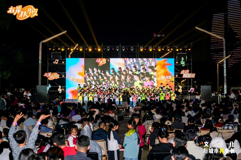 當晚的“右岸秋月夜”歌單,滿是秋的詩意與青春的朝氣,裹挾著蓬勃熱意感染全場。粵語經典《紅日》一響,瞬間點燃現場熱情;《戀愛ing》《小情歌》等曲目則以青澀旋律喚起共鳴。流行樂隊、實力唱將、素人歌手輪番登場,帶著對音樂的熱愛為演出注入鮮活能量。一首首經典曲目引發觀眾頻頻揮手合唱,手中的手環燈光閃爍交織,宛如一片璀璨星海,將獨墅湖的秋夜點綴得格外浪漫。