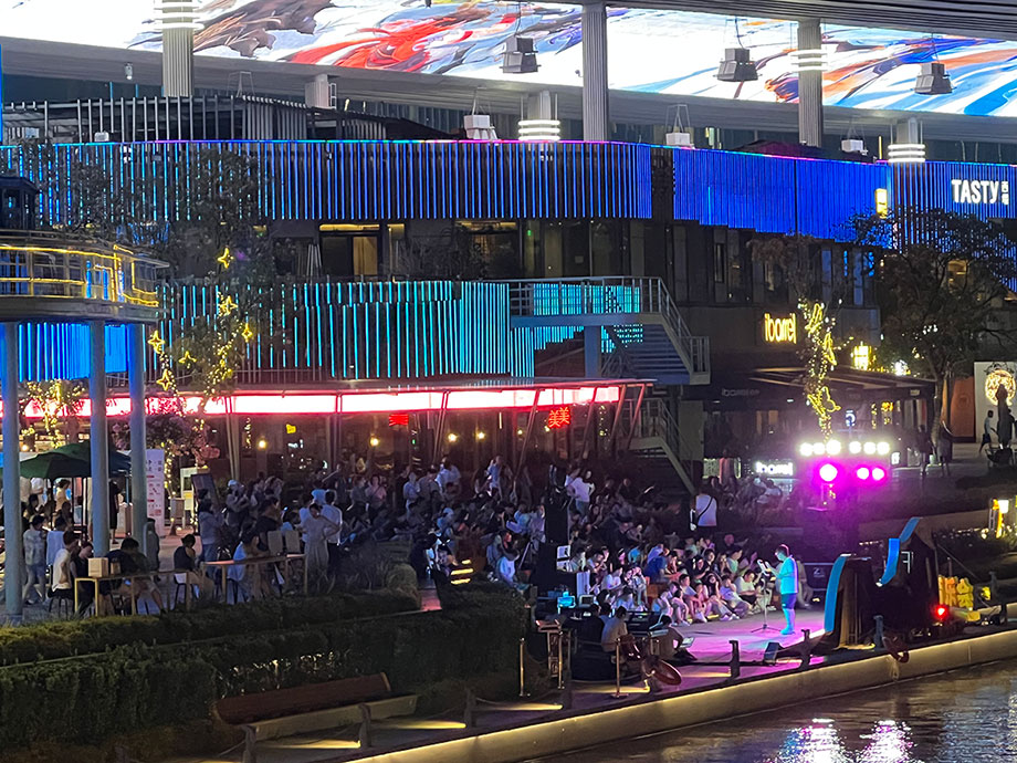 在園區(qū),藝術(shù)與人文交織的魅力夏夜并不僅限于右岸下沉式廣場。與“右岸仲夏夜”隔空相應,圓融天幕、月光碼頭等商業(yè)載體推出的一場場水岸音樂會,也不斷聚集著人氣與商氣,呈現(xiàn)著國際化新城區(qū)別樣的煙火時尚新場景。
