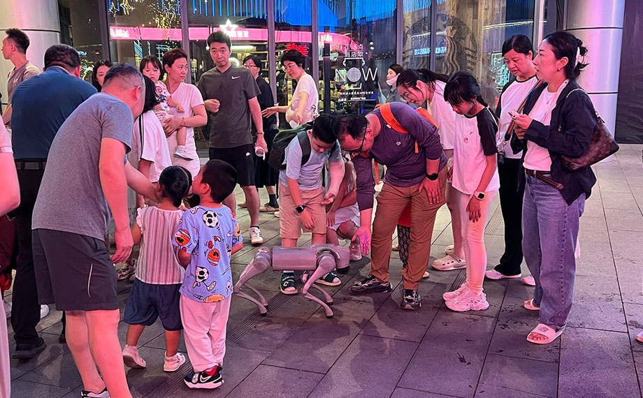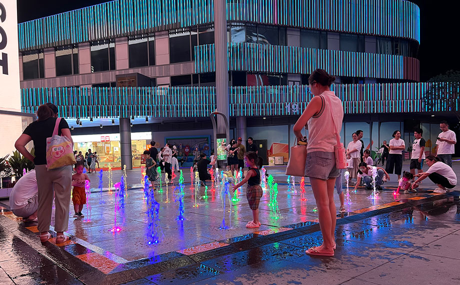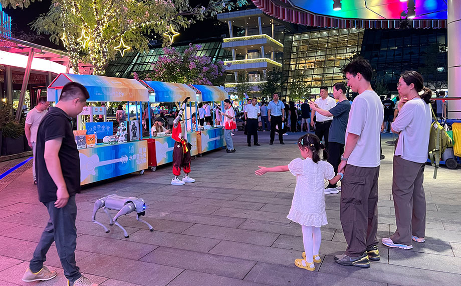 天幕下,變幻著燈光的地面噴泉讓愛玩水的萌娃樂此不疲,而臨近的水岸音樂會甄選市集上,哪吒造型的機器人、身姿靈活的機器狗也與大家握握手、跳個舞熱情互動,讓往來的大朋友、小朋友心動不已。“水岸音樂會積聚人氣,實現(xiàn)了很好的引流,不僅提升了市民的生活質(zhì)感,也為我們企業(yè)推廣搭建了全新的場景。機器人正當熱點,我們與圓融合作,在圓融天幕和月光碼頭都設(shè)置了展臺,提供機器人的表演、互動,以及配套小機器人的售賣,對于展示企業(yè)形象、能力,展現(xiàn)園區(qū)高科技活力,都是很好的平臺。”八方機器人經(jīng)理朱錦介紹說。