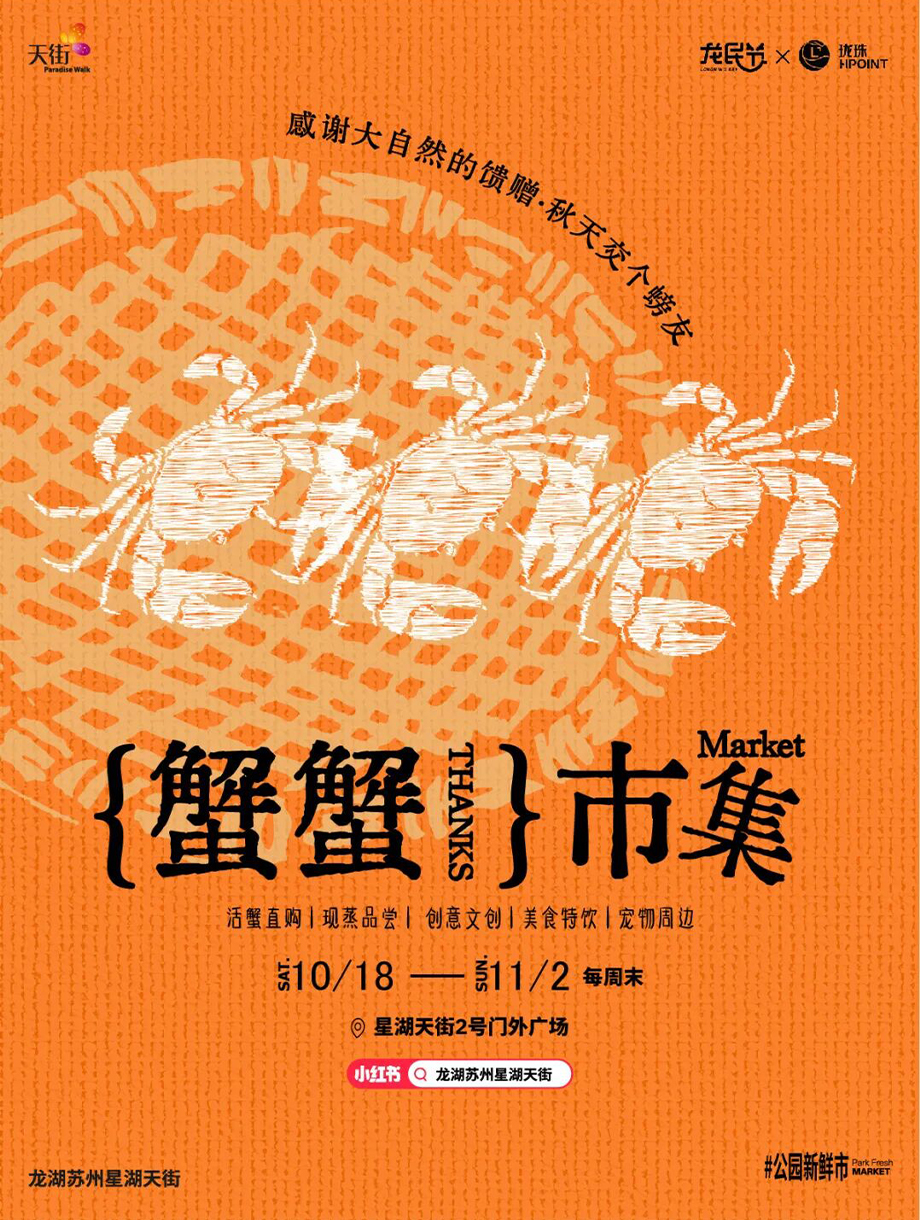 在龍湖蘇州星湖天街2號門外廣場的“蟹蟹市集”上,有蟹農現場售蟹,還有現蒸試吃,邀請市民游客用味蕾直觀感受蘇州大閘蟹的本地風味。更有蟹黃豆腐、螃蟹玩偶、螃蟹手工等20余家創意市集出攤,你可以在市集上找到各種形態的螃蟹。