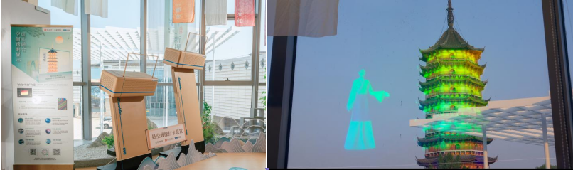 在蘇州絲綢博物館“未來館”二樓,基于虛實融合透明空間顯示打造的懸空成像打卡裝置已實現落地應用,體驗者無需佩戴VR、AR等設備即可感受裸眼3D動態場景呈現。裝置巧妙融合北寺塔實景與數字影像:窗外的千年古塔與屏中的三維動態模型交相輝映,為觀眾營造出時空交疊的沉浸式體驗。