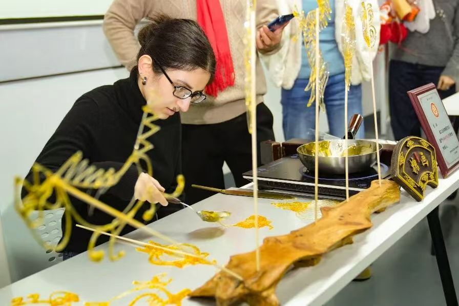 “糖畫不僅是一道美食,更是中國人對甜蜜生活、吉祥如意的寄托。”糖畫技藝傳承人李瑤的講解娓娓道來。在他的指導下,外籍學子們迫不及待展開體驗,他們親手執勺、以糖為墨,嘗試勾勒出駿馬、燈籠等寓意吉祥的新春元素。金黃色的糖漿如絲綢般流淌,眨眼間,一個個生動的圖案便在光潔的石板上凝固成型,引得陣陣驚嘆。