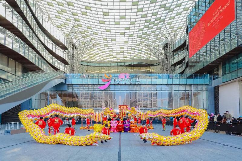 圓融時代廣場開展“龍騰獅躍游圓融”系列活動,特邀蘇州市舞龍燈非物質文化遺產代表性傳承人蔣達夫帶領的百花洲龍燈隊,傾情演繹“龍舞盛世,獅躍新春”,這場傳統與現代的激情碰撞,吸引許多市民游客參與現場互動。