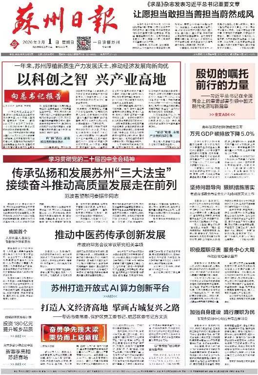習近平總書記在參加十四屆全國人大三次會議江蘇代表團審議時強調,江蘇要把握好挑大梁的著力點,在推動科技創新和產業創新融合上打頭陣,在推進深層次改革和高水平開放上勇爭先,在落實國家重大發展戰略上走在前,在促進全體人民共同富裕上作示范。一年來,蘇州深入學習貫徹黨的二十屆四中全會精神和習近平總書記對江蘇、蘇州工作重要講話重要指示精神,因地制宜發展新質生產力,推動科技創新和產業創新深度融合,在高質量發展的軌道上奮力書寫“向新向優”的時代答卷。