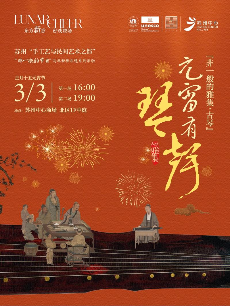 3月3日,蘇州中心商場(chǎng)北區(qū)一樓中庭將舉辦“非一般的雅集?古琴”專場(chǎng)。指尖輕撥,清音流轉(zhuǎn),邀市民與游客共赴一場(chǎng)滌蕩心靈的聽覺(jué)雅集。現(xiàn)場(chǎng)將奏響《賽馬》《梅花三弄》《上春山》等經(jīng)典曲目,共設(shè)兩場(chǎng)演出,分別于16:00、19:00開場(chǎng)。元宵佳節(jié),不妨移步蘇州中心,聽一曲清音入耳,共賞雅韻。