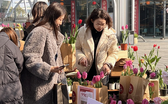 At the central square along Tianmu East and West Streets, diverse elegant blossoms including pure-white narcissus, golden double-petaled daffodils, sweet camellias, graceful phalaenopsis and colorful tulips drew crowds of passersby, who paused to admire the dazzling floral displays.