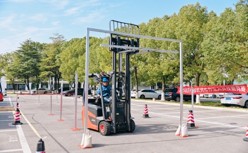 競賽設置預賽與決賽兩個階段,全方位檢驗選手綜合素養。預賽環節采用“理論+實操”的考核模式:理論測試涵蓋叉車安全操作規程、設備日常維護、應急處置流程及相關法律法規知識,重點考察選手安全理論功底與合規意識;實操項目為電動平衡重叉車帶托盤競速繞樁,選手需在5分鐘內完成“叉取托盤—轉運堆疊—指定存放—倒庫停車”全流程,考驗精準操控與高效作業能力。經綜合評定,40名選手憑借過硬實力脫穎而出,晉級決賽。