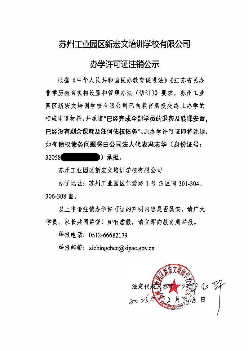 蘇州工業園區新宏文培訓學校有限公司辦學許可證注銷公示